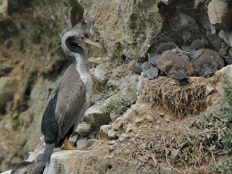 繁殖期有10-700對(duì)點(diǎn)斑鸕鶿同時(shí)在在峭壁邊緣配對(duì) 兩性共同在海濱沿岸的巖石上營巢,巢用海草和鳥糞筑一個(gè)大土墩。產(chǎn)1—4枚淡藍(lán)色的卵,28天-35天左右出雛,雛鳥在57 -71天長(zhǎng)出羽毛。雙親都參加撫育雛鳥工作,喂雛的方法是把魚貯藏于粗大的食管內(nèi),在喂食時(shí),親鳥張開嘴,雛鳥伸嘴入親鳥的咽部,在親鳥的口腔內(nèi)啄食半消化的魚肉。喂水時(shí),親鳥將取來的淡水從嘴噴出,注入雛鳥嘴里。雛屬晚成性。