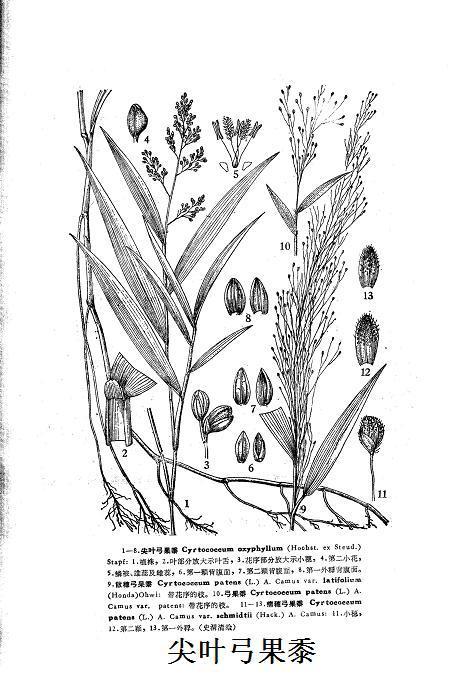 尖葉弓果黍,拉丁文名:Cyrtococcum oxyphyllum (Hochst. ex Steud. ) Stapf.禾本科、弓果黍屬 一年生草本。稈光滑無毛,葉鞘通常長于節(jié)間,僅上部一側邊緣被纖毛;頂端近圓形或齒裂,無毛;葉片質(zhì)較厚,基部略收狹,頂端長漸尖,兩面均無毛,主脈較明顯,脈間具小橫脈。圓錐花序緊縮,具多數(shù)密聚的小穗,抽出鞘外很短;分枝上舉,短粗而具棱,腋間常具疏柔毛;基部疏生數(shù)條細毛,穎及第一外稃質(zhì)較厚,近紙質(zhì),紅褐色,無毛;邊緣包卷長圓形的內(nèi)稃?;ü?0月至次年3月。概述圖片取之中國植物志