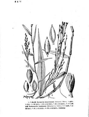 多年生草本。稈較纖細(xì),下部平臥地上,節(jié)上生根,花枝高15-40厘米。葉鞘大都短于節(jié)間、無(wú)毛、邊緣一側(cè)具纖毛;葉舌短小,長(zhǎng)約0.4毫米;葉片扁平,披針形、長(zhǎng)3-7厘米,寬4-9毫米,基部略呈心形,背部脈間具小橫脈。圓錐花序由單純總狀花序組成,長(zhǎng)4-6厘米,寬2-3厘米,有3-6枚分枝,分枝斜舉或近貼主軸;小穗綠色或成熟時(shí)變枯黃色,長(zhǎng)約4毫米,通常孿生或上部單生,一具長(zhǎng)柄,一具短柄,短柄者柄長(zhǎng)1毫米,疏生毛,長(zhǎng)柄者柄長(zhǎng)3-4毫米,近無(wú)毛;穎紙質(zhì),先端具扁平狀增厚的凸起;第一穎闊卵形,長(zhǎng)約3.5毫米,約為小穗3/4,具5脈;第二穎與第一外稃同形,均等長(zhǎng)于小穗,具5-7脈;第一小花中性,稀雄性,內(nèi)稃透明膜質(zhì),狹小,邊向內(nèi)卷;第二小花兩性,外稃平滑而光亮,骨質(zhì),長(zhǎng)3-3.5毫米,先端具兩側(cè)壓扁、稍扭卷呈鳳頭狀凸起,邊緣內(nèi)卷,包著同質(zhì)的內(nèi)稃;內(nèi)稃具2脊,頂端具反卷二尖凸;鱗被2,折疊,具5-7脈;雄蕊3,花柱基部分離。穎果橢圓形。葉片上表皮脈間最中行1-3行為無(wú)波紋,兩側(cè)2-3行為深波紋的長(zhǎng)細(xì)胞,最兩邊2-3行為有波紋、較狹長(zhǎng)的長(zhǎng)細(xì)胞,并有短細(xì)胞。染色體2n?=?18(Gould?et?R.?Sod.)?;ü?-10月。
