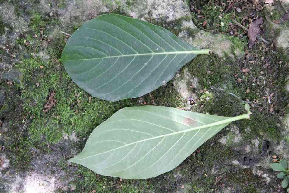 葉:葉紙質(zhì),卵狀長圓形或橢圓形,長10-20厘米,寬4.5-7厘米,頂端短漸尖,基部楔形,兩面無毛;側脈8-9對,在下面凸起,成45°角斜上升;托葉近圓形,與小枝近等寬。
