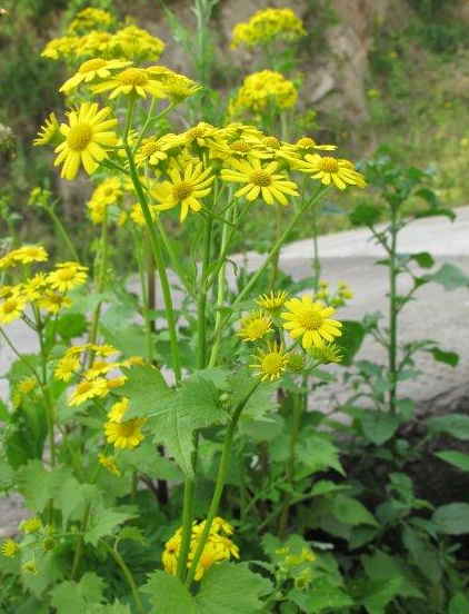 莖葉多年生草本。根狀莖粗短,徑5-6毫米,頸部蓋以殘葉基,被絨毛具多數(shù)纖維狀根。莖單生,直立,高約40厘米,不分枝,被疏蛛絲狀毛,變無毛至無毛?;~少數(shù),蓮座狀,花期生存,具長柄,葉片腎形,長4厘米,寬5厘米,基部心形,掌狀線重裂或重齒,齒約9,三角形,具硬骨質尖頭,側生的齒淺裂或具粗齒,膜質,兩面被薄蛛絲狀毛,但迅速脫落,掌狀5脈;葉柄長12-15厘米,被疏蛛絲狀毛,基部擴大;莖生葉3,較小,邊緣具狹裂及齒;葉柄短,具翅,翅短下延。頭狀花序5-6排列成頂生近傘形狀傘房花序;花序梗長約2厘米,被密黃褐色短柔毛,具絲狀苞片??偘瓲?,徑6-8毫米,無外層苞片;總苞片約13,1層,橢圓狀長圓形,長7-8毫米,寬2.5毫米,頂端尖,具緣毛,草質,邊緣干膜質,外面無毛,具5脈。舌狀花約10;管部長3.5毫米,無毛,舌片黃色,長圓狀線形,長約13毫米,寬2.5毫米,頂端具3細齒,具4脈;管狀花多數(shù),花冠黃色,長6毫米,管部細,檐部漏斗狀;裂片披針形,頂端尖;花藥長圓形,基部鈍,附片披針形。花柱分枝外彎,頂端截形,被乳頭狀毛。瘦果圓柱形,長1.5毫米,被短柔毛;冠毛白色,長約4.5毫米。[1]
