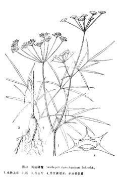 :多年生草本,高40–80厘米,全株無毛。根塊莖增粗。莖單一,中空,外面有細(xì)棱,從中部往上分布。基生葉早枯萎,莖下部葉有長柄,葉柄的基部擴(kuò)展成波針形的鞘,葉卵形,3出全裂,裂片再羽狀全裂,小裂片披針狀線形,2–9厘米,寬1–5毫米,先端漸尖,有突出的中脈,全緣,上部的葉較小,單一羽狀全裂,無柄,著生在披針形的鞘上。復(fù)傘形花序有6–18傘幅,傘幅不等長,有棱槽,向里的一面粗糙,無總苞片;小傘形花序約有20朵花,在梗上,有小總苞片10個,線形,邊緣膜質(zhì),不等長,花萼無齒;花瓣白色,倒卵形,先端微凹,有內(nèi)折的小舌片,外緣的花瓣增大;花柱基短圓錐狀,花柱往下彎曲,柱頭頭狀。果實(shí)橢圓形,長3–4毫米,果棱翅狀,側(cè)棱較寬,油管在棱槽間單一,寬,合生面上2條?;ㄆ?月,果期8月。