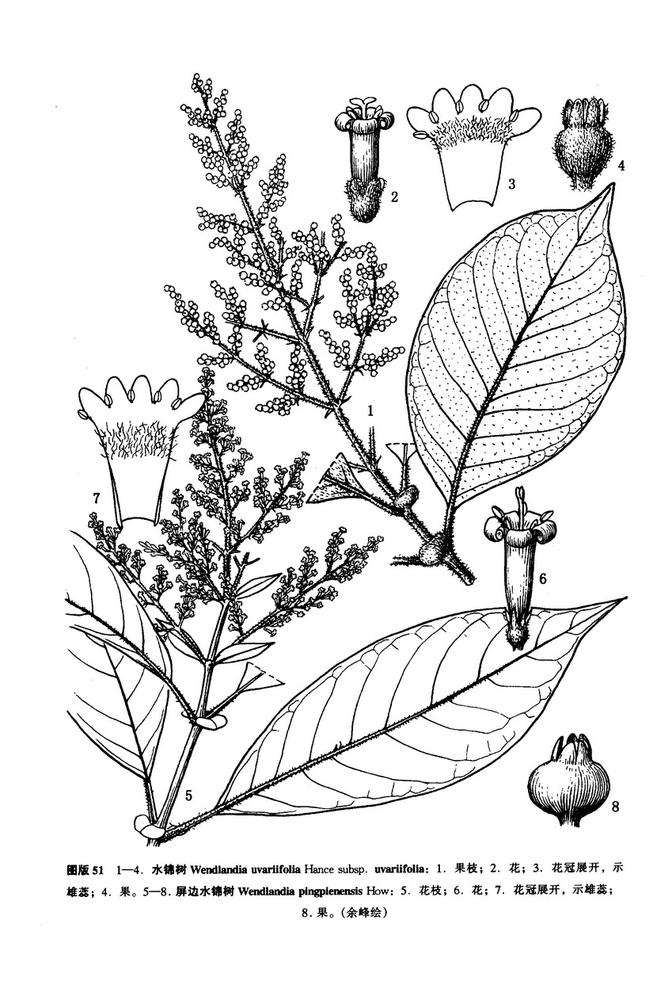 灌木或喬木,高3-15米。葉紙質(zhì),橢圓狀長圓形或倒披針狀長圓形,長7.5-23厘米,寬4-8厘米,頂端短尖或短尾狀尖,基部楔形或漸狹,上面無毛或有時(shí)在中脈上有疏短柔毛,下面僅脈上有極疏的短柔毛;側(cè)脈7-13對(duì),在下面明顯;葉柄長1-3厘米,有疏而緊貼的短柔毛;托葉近圓形,反折部分寬約為小枝的2倍。圓錐狀的聚傘花序頂生,廣展,長達(dá)30厘米,寬達(dá)24厘米,被緊貼的鐵銹色柔毛;花無花梗;花萼近球形,長1-1.5毫米,有疏柔毛,裂片鈍三角形,與萼管近等長或較短;花冠漏斗形,白色,外面無毛,長3.5-6毫米,冠管內(nèi)面上部有白色長硬毛,裂片長約1毫米;花藥橢圓形,長約1毫米,稍伸出;柱頭2裂,伸出。果小,球形,直徑1.5-2毫米,有短柔毛或近無毛?;ㄆ?-10月,果期6-11月。[1]