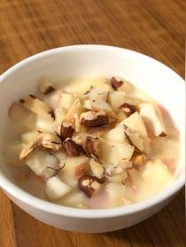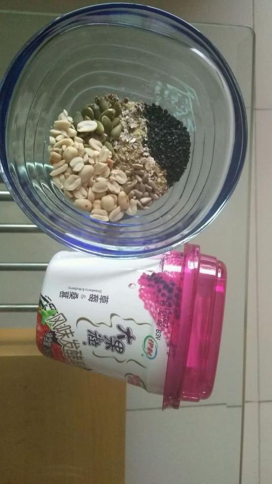 即食燕麥微波爐叮2分鐘,和各類果仁放入沙拉碗