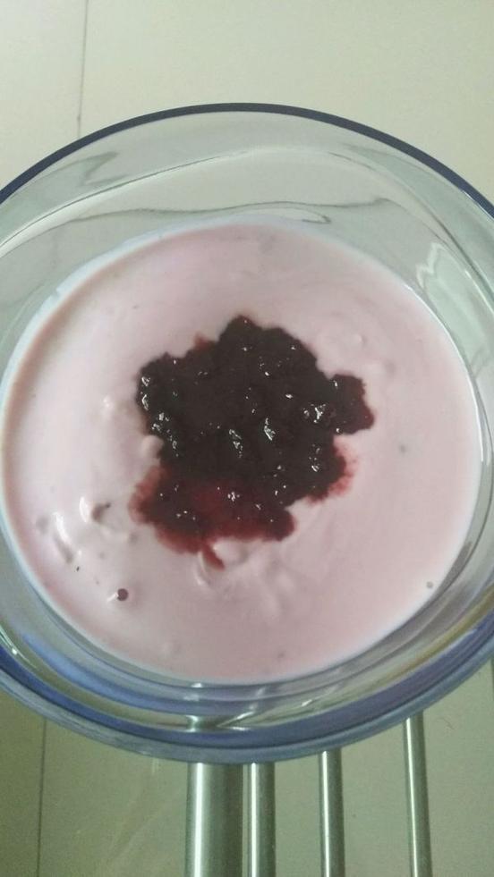 將酸奶倒入覆蓋果仁,櫻桃醬或其它果醬稍許加熱,放在酸奶上