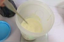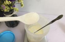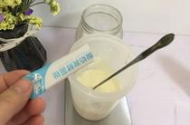 步驟三在溫?zé)岬呐D讨屑尤腚p歧桿菌1g、綿白糖35g,輕輕攪拌均勻
