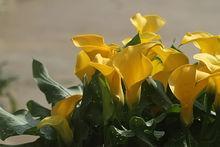 花梗修長是馬蹄蓮最適宜用來制作花束。在制作中盡量使花朵排布的顧盼有致、輕松自然,扎口不宜過緊以免勒傷花梗。將捆扎處裝飾后不妨露出參差不齊的基部,使花束看上去更加自然。如插入花瓶之前,一定要將基部剪齊,有利花材吸水保鮮。