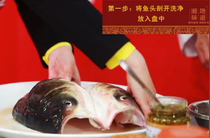 將魚頭剖開(kāi),洗凈,放入盤中;