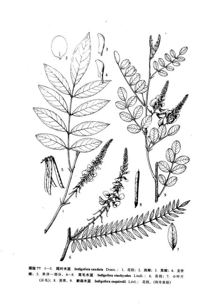 莖直立,褐色,圓柱形,疏被卷曲毛,幼枝具棱,灰褐色,密被棕褐色長柔毛或卷曲毛。羽狀復葉通常長12-18厘米,最長達30厘米;葉柄長2-3厘米,葉軸三棱狀,上面扁平或有淺槽,與葉柄均密被棕褐色近平貼或半開展丁字毛;托葉線形,長達7毫米,被棕褐色毛,毛常反曲,宿存或脫落;小葉2-5對,對生,卵形、橢圓形或卵狀披針形,長2.7-8厘米,寬1.7-3.2厘米,先端急尖或漸尖,具小尖頭,基部圓形或楔形,上面綠色,無毛,下面粉綠色,被白色并間生有棕褐色丁字毛,脈上毛較多,中脈上面微凹,下面明顯隆起,側(cè)脈6-9對,下面較上面明顯;小葉柄長2-3毫米;小托葉鉆形,長約2毫米,與小葉柄均被毛。
