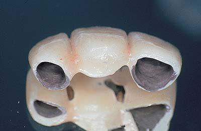 磨除牙體組織的量相對較大,且由于全瓷冠有一定的透明度,如果牙齒本身顏色較重,戴入后會透出內(nèi)部顏色,因此該修復(fù)體最適用于牙齒本身有較大缺損的活髓牙或用牙色樁核修復(fù)的殘根殘冠。