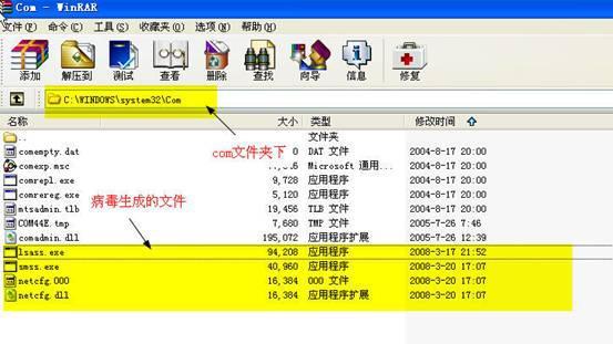 5.使用Winrar瀏覽windows32Com目錄下可以發(fā)現(xiàn)如下病毒文件