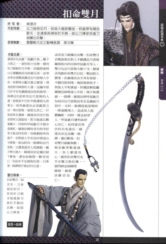 ◎外形特征:此刀細(xì)長(zhǎng)如月,前端大幅度彎曲,柄處帶有褐色獸毛,并連接長(zhǎng)鏈掛于手腕,能以刀揮使或當(dāng)?shù)舵i擲出攻擊。