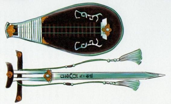 ◎外形特征:天一劍弦外形為一口翠玉琵琶,琴面為茶褐色,系有兩條絲弦,琴柄抽出即為一口碧青利劍,劍身雕有花紋以及劍銘