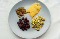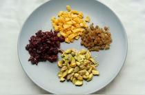 開心果用搟面杖碾碎,蔓越莓、芒果干、葡萄干切碎