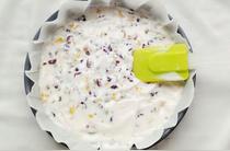 將混合物倒入模具,再加水果,雜亂無章地放就好了。