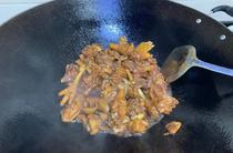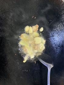 炒雞塊:冷鍋熱油,放入蔥姜蒜爆香,倒入雞塊煸炒出油,加麻辣汁上色調(diào)味,雞塊變色后撈出。
