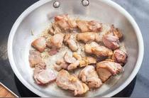 火力調(diào)至中高火,鍋燒熱倒入油,放入腌制后的雞腿,煎至金黃,取出。