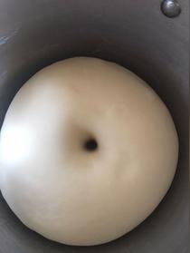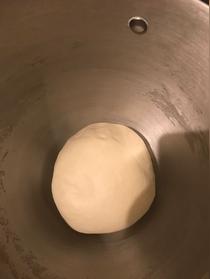 除黃油外所有材料,先揉成團(tuán)。需要揉十分鐘。再加入黃油,繼續(xù)揉十分鐘。揉至出筋膜。我是廚師機(jī)揉的。沒有機(jī)子的手揉也是一樣的。需要反復(fù)揉搓摔打至出膜。