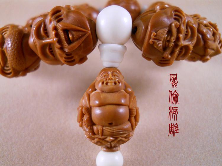 橄欖核雕十八個羅漢頭,選取佛教中經(jīng)典人物為題材,根據(jù)橄欖核特有外形,結(jié)合羅漢神態(tài),所刻出來的核雕作品。其神態(tài)各異、惟妙惟肖、立體感強、人物有神作品的構(gòu)思和雕刻都達到了極高的工藝水平和藝術(shù)境界,為核雕藝術(shù)品中的精品制作。
