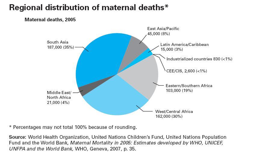發(fā)展中國家的孕產婦死亡率是每10萬次分娩290人,而發(fā)達國家則為每10萬例14人。國家之間的差距很大,一些國家的孕產婦死亡率極高,每10萬例活產多達1000人或以上。各國國內的高收入者和低收入者之間以及城鄉(xiāng)居民間的差距也很大。