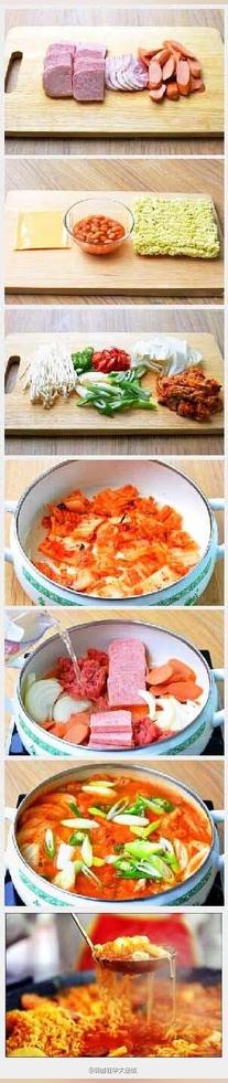 配的美食圖則是一組超市常見(jiàn)的食材,火腿腸、肉片、方便面以及韓國(guó)特色的辣白菜等,隨后將這些食材倒入鍋中——煮。最后一張圖片亮瞎了不少網(wǎng)友,端上一碗超幸福的“部隊(duì)火鍋”竟然神似一碗香辣牛肉方便面。