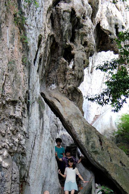 另有佛像四十多尊,造型優(yōu)美,形象萬千。內(nèi)洞鐘乳石千姿百態(tài),栩栩如生。洞中有石階通向上部,共385級。沿著一縷光線,人們拾級而上,就可出此洞,登上山頂?shù)摹安皆啤?、“環(huán)翠”等涼亭,遠眺山勢起伏,雄偉壯觀。