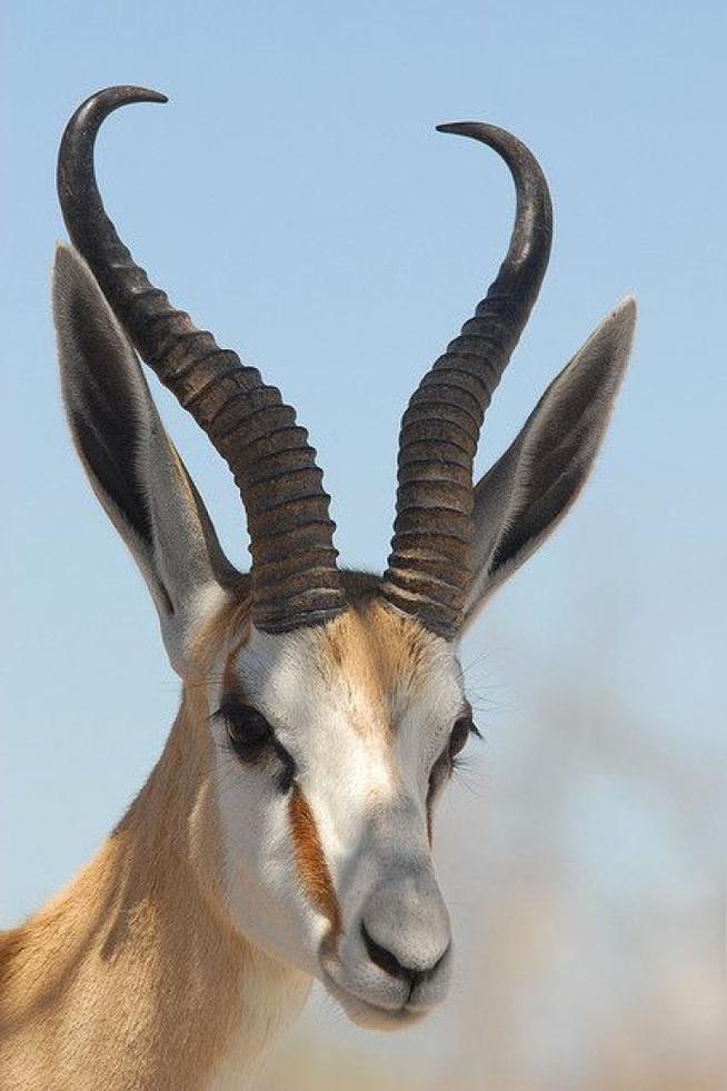 雄性有角,角先向后彎,再向上彎。屬中型??苿?dòng)物。雄性黑斑羚有像小豎琴一樣的角。