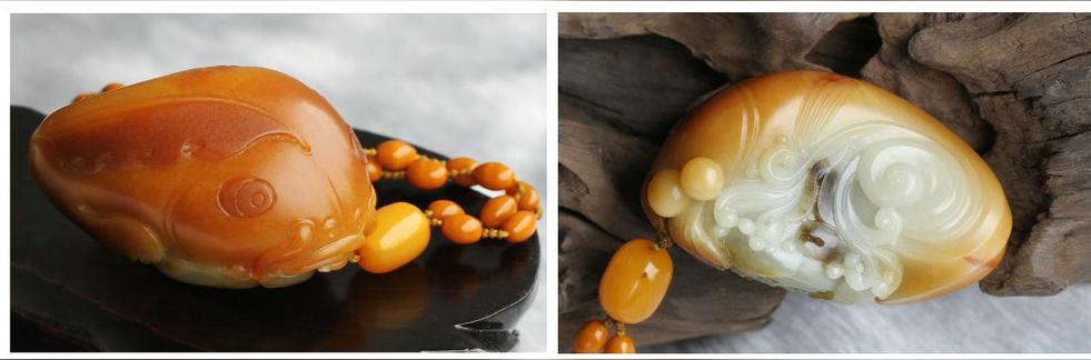 取2011年中國工藝美術(shù)“百花獎”金獎作品《年年有魚》為例:這塊典型的黃沁籽料,利用顏色分割的巧雕手法,使得原料多樣的皮色有層次地凸顯出來。這件作品做工獨到,頭部渾圓飽滿,神態(tài)憨厚出神,背側(cè)雕蓮子,水花四濺,寓意連生貴子。整件作品充滿吉瑞福愿,給人印象深刻。