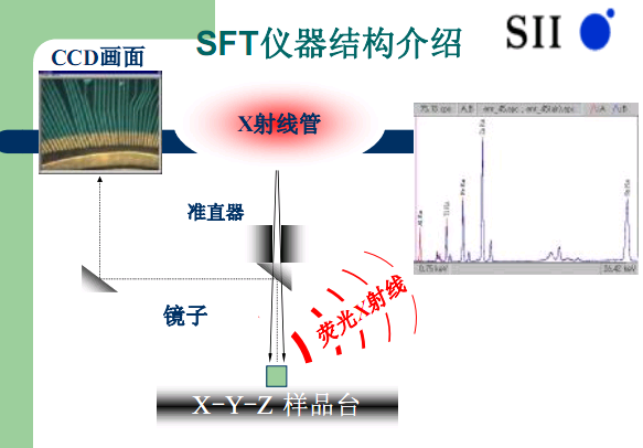 SII的產(chǎn)品是利用螢光X射線得到物質(zhì)中的元素信息(組成和鍍層厚度)的螢光X射線法原理。和螢光X射線分析裝置一樣被使用的X射線衍射裝置是利用散亂X射線得到物質(zhì)的結(jié)晶信息(構(gòu)造)。而透過X射線多用于拍攝醫(yī)學(xué)透視照片。另外也用于機場的貨物檢查。象這樣根據(jù)想得到的物質(zhì)信息而定X射線的種類。