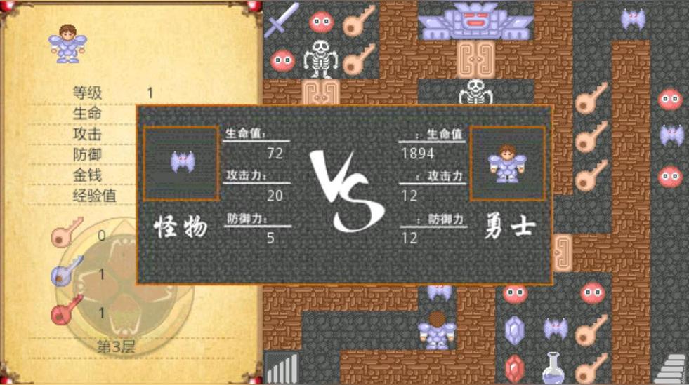 雖然魔塔的界面很像是一般的地牢游戲,貌似隨便的打打殺殺就可以過關,但事實上玩這個游戲需要動很多腦筋,任何一個輕率的選擇都可能導致游戲的失敗,該游戲有屬性攻擊、防御、生命、金幣、經驗。對怪物的傷害次數(shù)計算公式,是敵人的生命/(自己的攻擊-敵人的防御);而傷害的數(shù)目計算是怪物傷害次數(shù)(敵人的攻擊-自己的防御)。