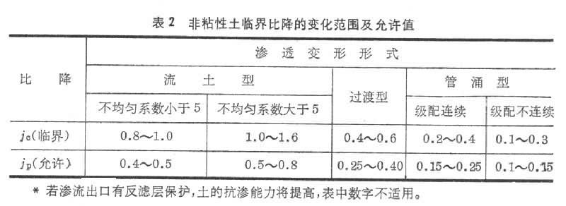 此外,當(dāng)滲透變形形式確定后,也可根據(jù)表2選取臨界比降與允許比降值。其中允許比降值的確定是采用了1~2的安全系數(shù)。鑒于流土破壞對建筑物的安全威脅最大,一般安全系數(shù)取大值,管涌一般取1.0~1.5。