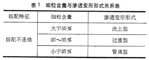 砂礫石地基上的水工建筑物滲透變形的發(fā)生及其形式的判斷,在很大程度上取決于地基砂礫石的級配特征。20世紀(jì)50~60年代,砂礫石層滲透變形形式的判斷,多以不均勻系數(shù)Cu)=d60/d10(d60、d10為土粒粒徑,小于該粒徑的顆粒重量分別占總重量的60%和10%)為依據(jù),Cu)小于10的土滲透變形形式為流土;Cu)大于20的土為管涌土。60年代后,通過大量工程實踐,發(fā)現(xiàn)級配不連續(xù)的土,盡管不均勻系數(shù)大于20,如果細(xì)粒含量大于35%,其滲透變形形式仍然是流土。因此,對于級配不連續(xù)的土,提出以細(xì)粒含量作為判別滲透變形形式的標(biāo)準(zhǔn)(表1)。區(qū)分粗細(xì)粒徑的方法是:對級配不連續(xù)的土,以顆粒組成曲線中缺乏的粒徑組或含量不足3%的粒徑組,為粗細(xì)料的區(qū)分粒徑;對級配連續(xù)的土,方法較多,一般為了簡便,有的以1.0mm也有的以2.0mm作為區(qū)分粒徑。雙層地基的滲透變形形式主要為接觸沖刷。一般認(rèn)為相鄰兩層土體的d10比值小于或等于10,且兩層土的不均勻系數(shù)均小于或等于10時,將不致產(chǎn)生接觸沖刷。反之,則應(yīng)考慮接觸沖刷問題。凡兩層土體之間的滲透系數(shù)比值等于或小于10,或者兩層土體的d20比值小于或等于3時,可按單層土體結(jié)構(gòu)來考慮(d20為土粒粒徑,小于該粒徑的土重占總土重的20%)。