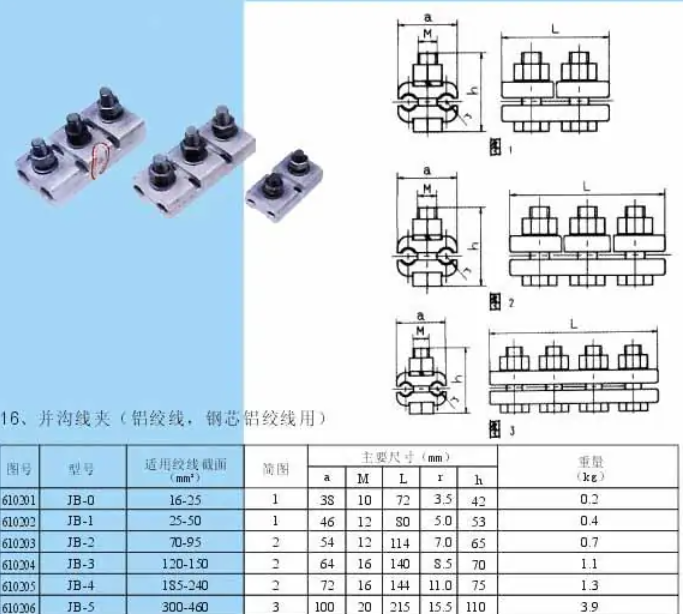 并溝線夾均為非承力型,主要有螺栓式并溝線夾、H型(或C型)并溝線夾和楔型并溝線夾等3種,其中螺栓式并溝線夾又分為等徑并溝線夾和異徑并溝線夾兩種。