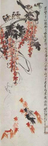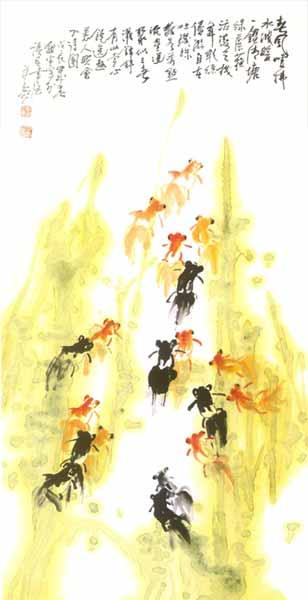 詩,詩畫有機融合,而成妙趣橫生的氣象。鄭輔宣作于庚午(1930年)夏六月的《魚雀圖》,畫面的底部是一群嬉戲的金魚向上而游,長尾飄蕩,千姿百態(tài),色彩斑斕,或施紅或染黑。畫面的上部是凌空垂掛的紫藤,幾撮紫藤花紅欲流丹,色彩文雅,艷而不妖,寧靜中還透著安詳。紫藤枝頭上方有六只麻雀,機靈生動,栩栩如生,神態(tài)各異,活潑歡快,與下面游魚互相觀望,上下遙相呼應,使整個畫面充溢著熱烈喧鬧的氣氛。畫作淡雅秀逸,情趣天然,氣韻連貫,筆酣意暢,賦色清淡,間用重色點醒,技法融合中西。金魚,重在神似,銜接若有若無,若隱若現(xiàn),雖不畫水,但又宛在水中,金魚的姿態(tài)婀娜優(yōu)美,活潑生動,極富動感。紫藤老干嫩條如虬龍般纏繞,呈現(xiàn)充塞天地的勃勃生氣,而且密而不結,疏而不散,似亂非亂,可長可短,能彎曲,有舞蹈般的優(yōu)美姿態(tài),讓人聯(lián)想到萬紫千紅的春天。棕色的麻雀則形象活脫,富有情趣,意境高雅脫俗。右側題上七絕詩一首,詩曰: