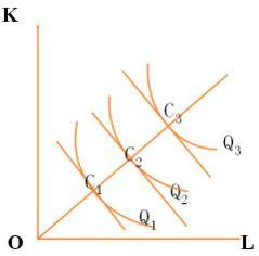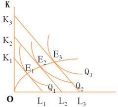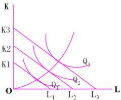 當(dāng)要素價格不變,廠商增加投入的成本,則等成本線就會向遠(yuǎn)離原點(diǎn)的方向移動,它們和各等產(chǎn)量曲線會有一系列切點(diǎn),其均衡的產(chǎn)量就會沿著這些切點(diǎn)逐步增加,把這些切點(diǎn)連接而成的線,就叫做生產(chǎn)擴(kuò)大路線。生產(chǎn)擴(kuò)大路線有三種情況。其中:K為資本,L為勞力。